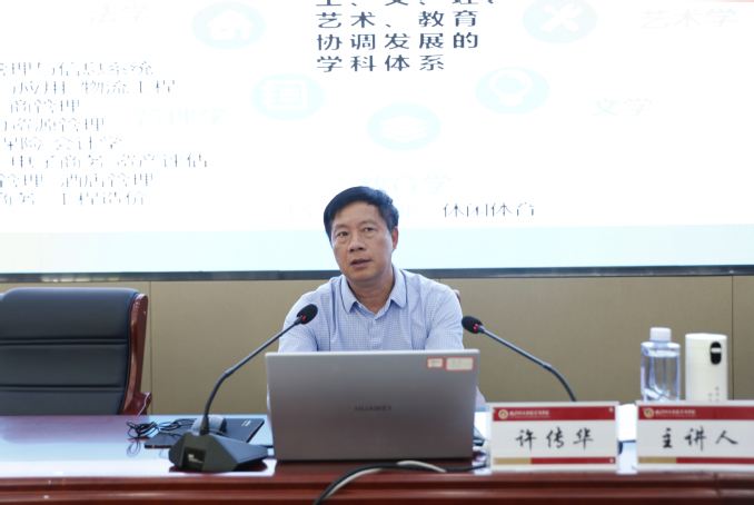 许传华以“新时代学科建设高质量发展的实践与创新”为题作专题辅导报告。他重点围绕学科布局与演进、发展机遇与挑战、实践探索与创新三个方面进行了系统阐述和深刻讲解。对于如何实现新时代学科建设高质量发展,他建议,一要全局谋划顶层设计,锚定“双升”战略部署,优化学科布局,推动学科交融;二要精准施策靶向用力,统筹学科要素、激发组织动能,推动学科战略转型升级;三要接续奋斗砥砺前行,在数字经济背景下推动学校学科建设高成长高质量发展。