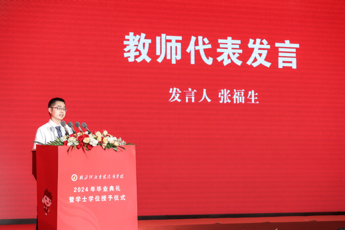教师代表、信息管理与工程系张福生副教授代表全体教师向毕业生们表达最真挚的祝福和期待,他表示:在数学的世界里,众所周知的是一个问题至少有一种解题办法。只要思想不滑坡,办法总比困难多。在人生的道路上,也要寻找那些能够将自己带到成功彼岸的“公式”和“定理”。正如极限的定义,无论目标多么遥远,只要不断逼近,终将到达。正如导数的概念,它揭示了函数在某一点的局部性质。当面临人生抉择时,不妨回顾一下求学时的初心,思考自己的方向和目标。只要明确了方向,勇敢地迈出斜率为正的第一步,就能描绘出不断向上的人生曲线。
