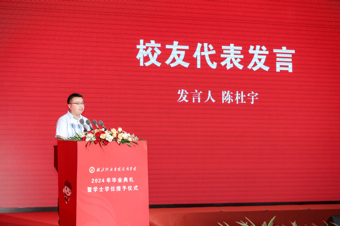 杰出校友、造血干细胞无偿捐献者、工商管理系市经19401班陈杜宇作为校友代表发言时说道:“一个月前,我在省红十字会骨髓库的安排下,完成了造血干细胞无偿捐献。采集前我一夜未眠,第一次觉得夜晚是如此漫长,紧张和不安交织在心头。从接到通知到完成捐献,整个过程有半年之久,其间一共经历了配型、高分辨、体检、动员等环节。这一切都源于大一入校时,我在七品居旁的爱心献血车登记成为中华骨髓库志愿者。生命在此刻形成了闭环,五年前留下的血样,让我有幸为远在广东的血液病患者送去了生命的种子。”他勉励即将离开学校奔赴远方的学弟学妹们:要坚守理想、要勇于奉献、要担当责任。最后,他真诚祝愿母校积历史之厚蕴,展时代之宏图;祝福法商学子怀揣感恩与梦想,不忘热血与担当。