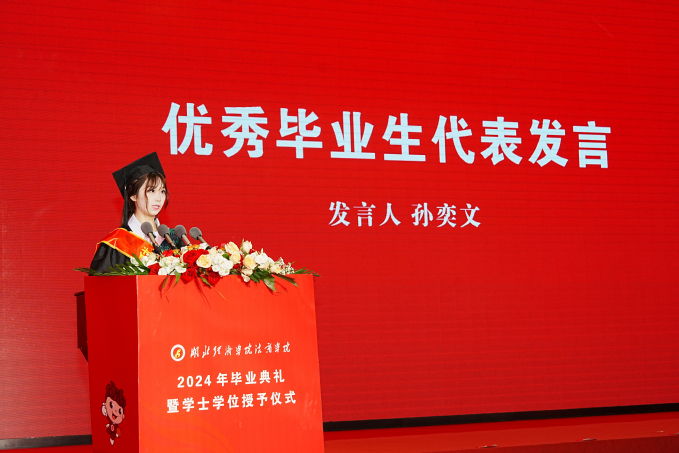 优秀毕业生代表、会计20410班孙奕文同学在发言时说道:“转眼间,我们即将挥手道别挚爱的法商,告别图书馆的书香、告别三清园的灌汤包、告别求索桥畔的樱花……也要与可亲可爱的老师们说再见。我们有幸亲历了中国共产党成立100周年的光荣时刻,有幸参与了法商万搏买球联赛官网(中国)官网办学20周年的庆典,有幸见证了法商万搏买球联赛官网(中国)官网在各类排名中的升级晋位。今天,我们共同迎来了人生新起点,感谢母校的悉心培养,感谢老师们的谆谆教诲,感谢家人朋友们的关爱和支持!”