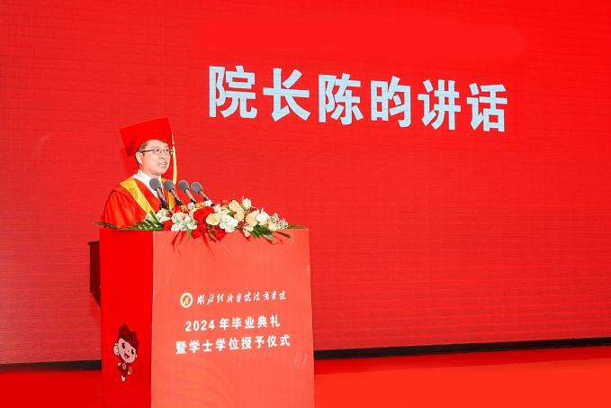 院长陈昀教授作《为即将在市场中搏击的你们加油!》主题讲话。他首先向3499名2024届毕业生致以热烈的祝贺和美好的祝福!向所有奋战在立德树人岗位上的老师、莅临现场参加毕业典礼的家长、校友以及社会各界朋友表示感谢!
