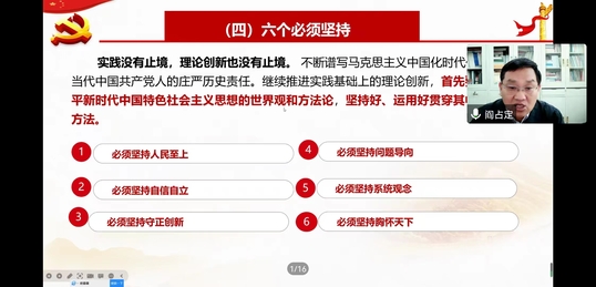 阎占定教授从深刻领会党的二十大的主题、主要成果,过去5年的工作和新时代10年的伟大变革,开辟马克思主义中国化时代化新境界,中国式现代化的中国特色和本质要求,全面建设社会主义现代化国家的目标任务,坚持党的全面领导和全面从严治党的重大部署,以顽强斗争精神应对风险挑战的要求等七方面,对党的二十大精神进行系统宣讲和深入阐释。