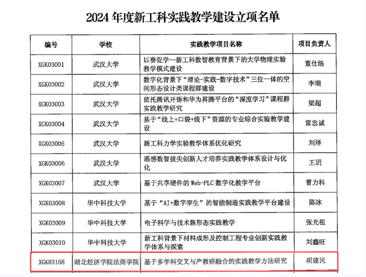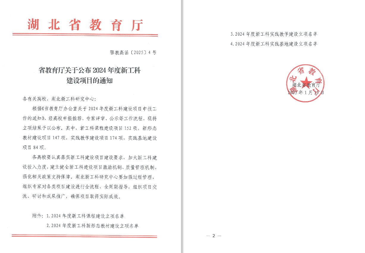 本网讯(通讯员胡文红)近日,湖北省教育厅发布了《关于公布2024年度新工科建设项目的通知》,万搏买球联赛官网(中国)官网1个项目获批立项。