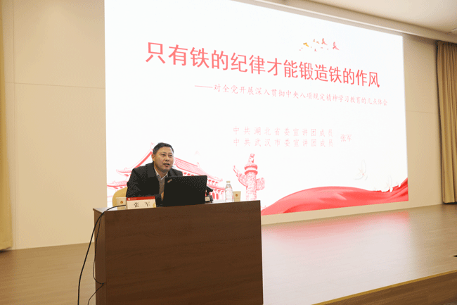 湖北省委宣讲团成员、武汉市委宣讲团成员张军教授作《只有铁的纪律才能锻造铁的作风》主题报告。张军教授深入阐述了开展深入贯彻中央八项规定精神学习教育的重大意义和深远影响,从蔡和森首提“党的纪律为铁的纪律”、中共五大成立中央监察委员会、“六项注意”到“三大纪律八项注意”、“延安作风打败西安作风”、“两个务必”和新中国成立后的艰苦朴素作风等六个方面回顾了作风建设贯穿党史发展的全过程,并指出,“四风”问题禁而难绝,作风建设永远在路上。