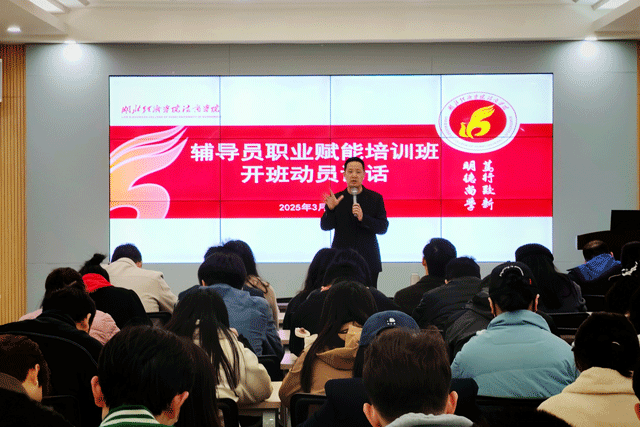 本网讯(通讯员 万山英)为进一步提升辅导员队伍专业化、职业化水平,以高素质辅导员队伍建设支撑高质量思想政治教育工作,3月28日,学院在法商楼111室举行春季学期辅导员职业赋能培训班开班仪式。院党委副书记、副院长杨宏斌出席,各系党总支书记、全体辅导员参加。