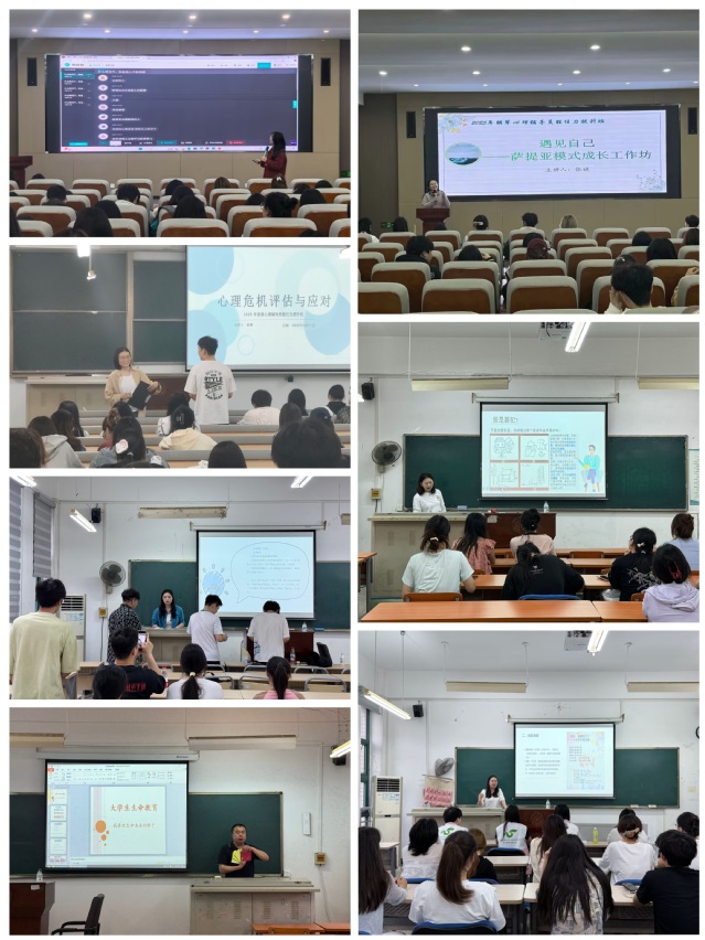 培训首日,心理中心封静老师主持了开班仪式,并作“朋辈互助沟通技巧暨常见问题操作实务指导”专题讲授。封静结合丰富案例,深入讲解朋辈沟通技巧,并演示了常见问题及处理方法。第二讲由心理中心张婕老师带领学员开启萨提亚模式的自我探索之旅,通过“冰山理论”解析情绪与行为的内在逻辑,并借助小组互动等形式,引导学员觉察自身沟通模式与心理资源。第三讲中,心理中心陈静老师聚焦校园高危心理问题评估与应对,课程结合真实案例,详细讲解危机信号的辨别要点、干预流程及伦理规范,并通过角色扮演强化学员的应急处理能力。第四讲培训特邀陈璐、余波、伍莉、陈晓婧四位老师授课,他们从自我探索、生命教育等主题,采用讲授和团体互动相结合的形式,为学员们提供了多维度的心理成长体验。
