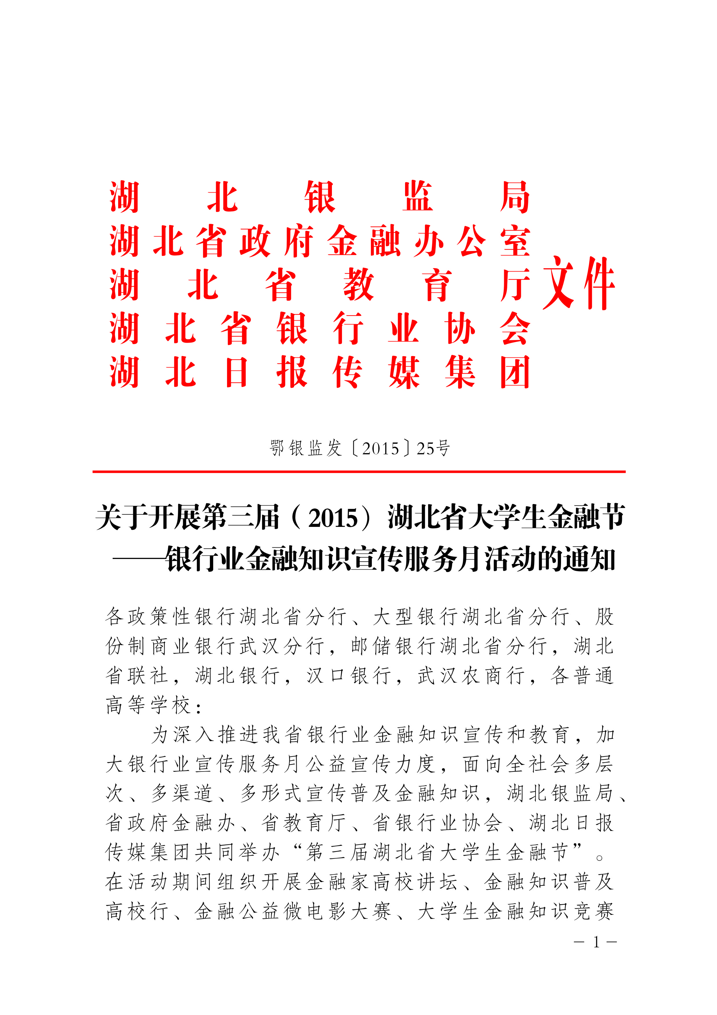 转发鄂银监发〔2015〕25号 关于开展第三届(2015)湖北省大学生金融节――银行业金融知识宣传服务月活动的通知