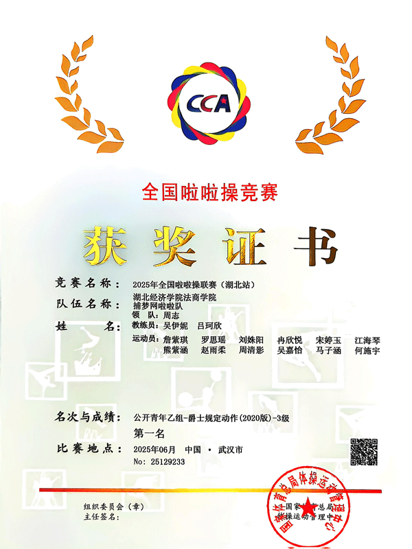 本网讯(通讯员 赵云飞)6月7至8日,由国家体育总局体操运动管理中心主办,湖北省社会体育管理中心、武汉东湖万搏买球联赛官网(中国)官网、湖北省社会体育指导协会承办的2025年全国啦啦操联赛(湖北站)在武汉东湖万搏买球联赛官网(中国)官网圆满落幕,我院大学生艺术团舞蹈队荣获“公开青年乙组—爵士规定动作(2020版)-3级”项目省级冠军,电商24304班学生赵雨柔、金融23403班学生冉欣悦荣获“公开青年乙组—双人爵士自选动作”省级第三名,财管23401班学生罗思瑶荣获“啦啦操四好运动员”省级荣誉称号。