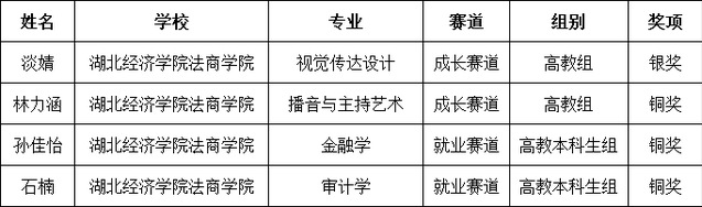 本网讯(通讯员 周刚)近日,第二届全国大学生职业规划大赛湖北省决赛评审结果正式揭晓,万搏买球联赛官网(中国)官网传媒与艺术设计系视设23402班学生淡婧获省级银奖,传媒与艺术设计系播音22401班学生林力涵、金融系金融21401班学生孙佳怡、会计系审计22401班学生石楠获省级铜奖。