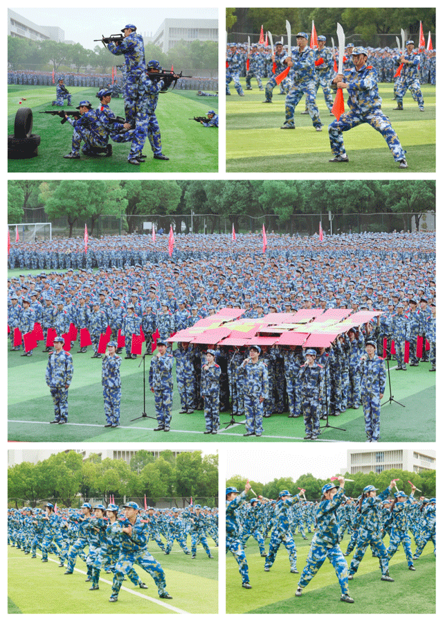 军训成果展示以深情的《不朽》朗诵开场,赞颂英雄精神。队形表演中,同学们变换出中国地图、万里长城、五星红旗等壮丽图景,高呼校训与强国誓言。匕首操刚劲,军体拳孔武,破风八刀气势如虹,战术演练更是在硝烟中模拟出真实战场。最后,各系新生方阵分列式表演,在军训团的带领下,步伐铿锵,口号嘹亮,依次通过主席台接受检阅,展现了昂扬向上的精神风貌。