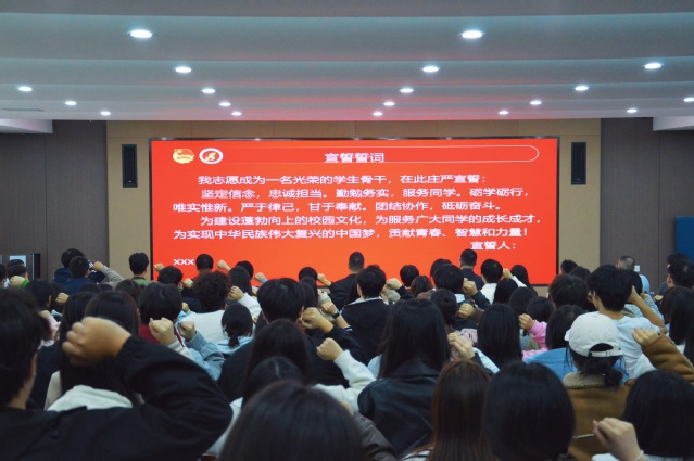 仪式在庄严的国歌声中拉开序幕。首先,院团委指导老师赵云飞介绍了培训方案,明确理论学习、实务技能、交流研讨三大模块,并强调考勤纪律,要求学员全程参训、确保实效。随后,杨宏斌在讲话中充分肯定学生骨干在思想引领、校园治理、志愿服务等方面的担当作为,并从“坚定理想信念、锤炼过硬本领、强化服务意识”三个方面提出殷切期望,鼓励大家发挥先锋模范作用,成长为让老师放心、让同学信赖的骨干力量。最后,全体学员庄严宣誓,承诺忠诚履职、服务同学、率先垂范、不辱使命。仪式在激昂的团歌声中结束。