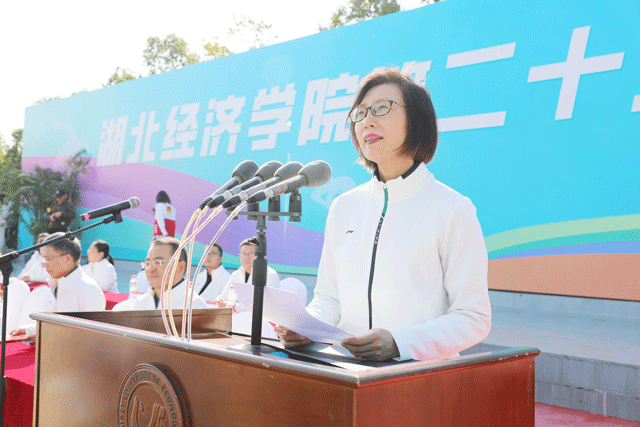 湖北经济万搏买球联赛官网(中国)官网校长方洁致开幕辞。她指出,体育承载着国家强盛、民族振兴的梦想,关乎人民幸福,关乎民族未来,代表着青春、健康与活力。学校始终将体育工作深度融合人才培养与校园文化建设,举办“以体强身”的活动赛事,落实“以体润心”的运动理念,营造“以体育人”的校园氛围,展现学校团结奋进、追求卓越的精神风貌。方洁希望运动员们展现“更快、更高、更强、更团结”的奥林匹克精神,全体裁判员和工作人员严谨细致做好比赛服务,全体师生在体育锻炼中享受乐趣。