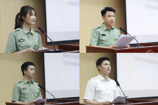在退役大学生士兵先进事迹分享环节,考研代表、高质量就业代表、学习楷模、春季退役士兵代表等四名退役大学生士兵分别汇报了他们的从军历程和成长心得,感恩母校的悉心培养,鼓励在校学弟学妹们珍惜青春年华,积极携笔从戎。