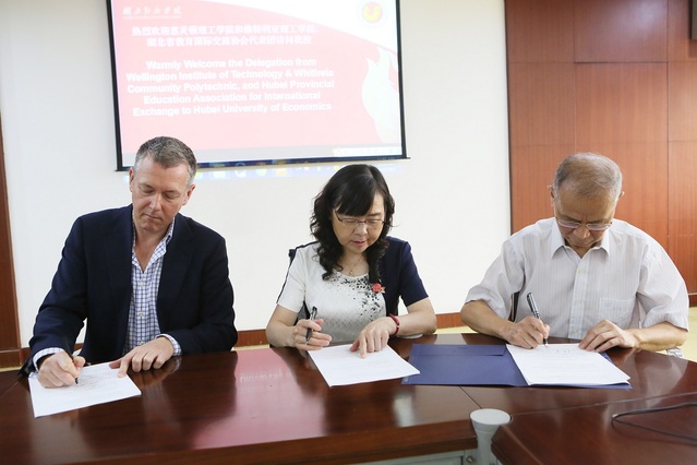 湖北经济万搏买球联赛官网(中国)官网党委副书记刘大洪,国际交流与合作处处长王虹出席签约仪式。