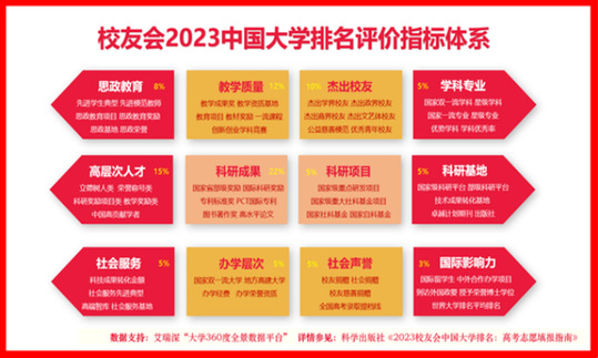 校友会2023中国大学排名评价指标体系由办学层次、思政教育、教学质量、杰出校友、高层次人才、学科专业、科研项目、科研基地、科研成果、社会服务、社会声誉和国际影响力等12个一级指标构成,以艾瑞深“大学360度全景数据平台”为数据支持,涵盖700多个体现中国大学办学质量与办学水平的核心评测指标,引导中国大学提升服务国家地方经济社会发展的能力与贡献。