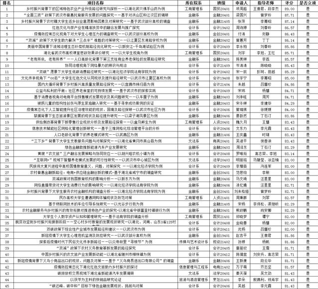 经学生自由组队申报,各系团总支初审,院团委实践部二审筛选,由院团委根据申报项目的学科门类以及项目申报情况聘请相应的学科专业教师组成评审委员会进行打分,现拟选出排名前45支团队通过立项,进行第十一期学生科研。具体名单公示如下: