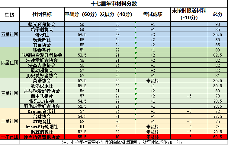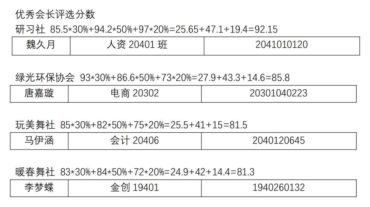 综合社团年审分数、现场述职打分、社团管理办法考试分数,现将优秀会长评选情况公布如下: