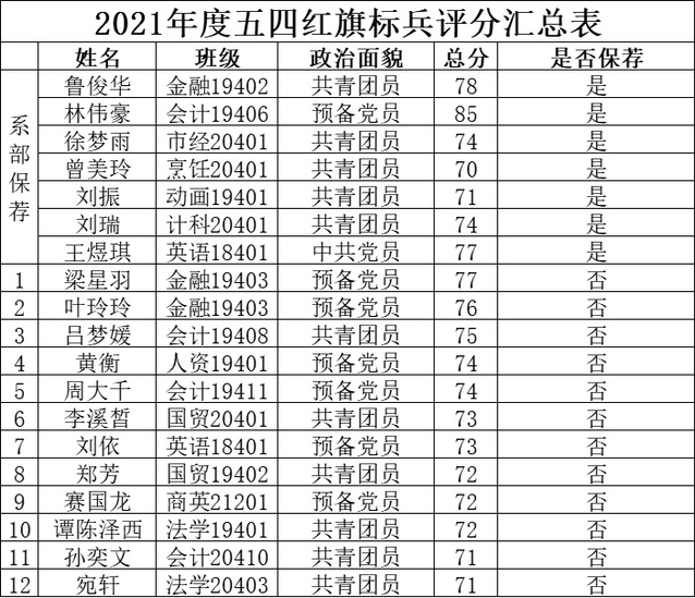 根据《关于评选2021年度“五·四”先进集体和优秀个人的通知》(鄂法商团字〔2022〕2号)要求,各系团总支在系党总支的领导下严格执行评选标准和程序,批准了一批优秀的大学生参与2021年“五·四红旗标兵”荣誉称号的评选。院团委通过资格审查和加分审核,确认各系总分排名第一的学生直接保荐为“五·四”红旗标兵共7人;另外入12名同学参与展示,取前8名学生授予“五·四”红旗标兵荣誉称号。具体名单如下: