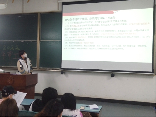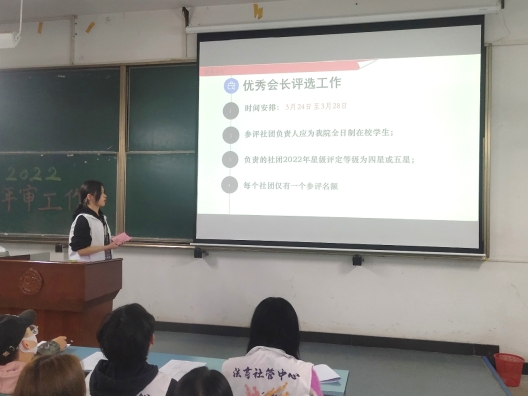 首先由社管中心年审负责人向社团讲解社团年审的具体事务内容,针对社团年审星级评定、年度考核标准和相关材料递交要求等内容做详细讲解并严格要求执行。