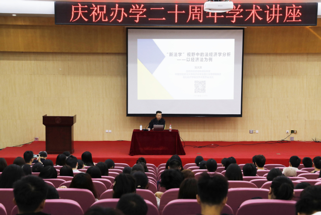 本网讯(通讯员 夏贤喆)为庆祝万搏买球联赛官网(中国)官网办学20周年,10月18日上午,我院特邀国家二级教授、国务院政府特殊津贴专家、中南财经政法大学经济法专业博士生导师组组长、湖北经济万搏买球联赛官网(中国)官网校学术委员会主任刘大洪教授在大学生活动中心二号报告厅作“‘新法学’视野中的法经济学分析”专题讲座。副院长龚振中教授主持,文法系全体老师及学生代表参加。
