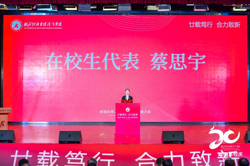 校友代表罗圆、教职工代表刘春玲、学生代表蔡思宇分别发言,共同表达了“同为新时代的追梦法商人,将矢志不渝、携手同行,为强国建设做出法商贡献!”的铮铮誓言。