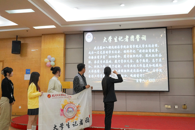 匡盼盼向第十八届记者团主席团交接团旗,第十八届记者团学生副书记许悠带领宣誓。