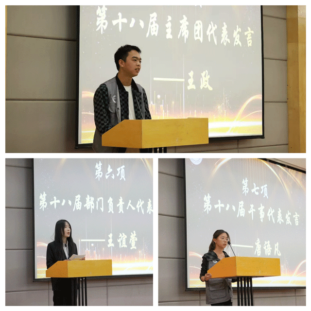 第十八届记者团主席团代表王政、部门负责人代表王谊萱,以及新生干事代表唐语凡依次上台发言
