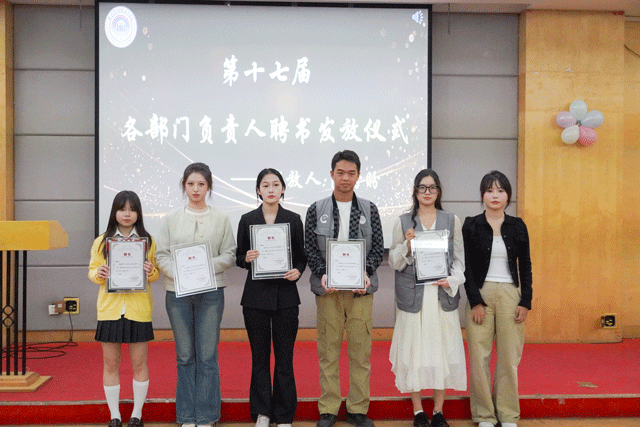 单敏为第十七届记者团团长匡盼盼颁发聘书;郝甜为第十八届记者团主席团成员授牌;匡盼盼为第十七届记者团各部门负责人颁发聘书。