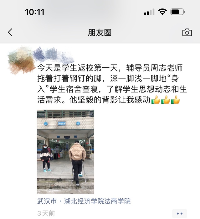 可是开学在即,他放不下系里的工作,放不下自己所带班级一百多名学生,强烈的责任心和使命感使他负伤不卸任,拄拐回一线。在2月21日晚,学生返校晚讲评现场,周老师一站就是2个多小时,晚讲评结束时胳膊已经麻木了,但他却说“讲台就是我的舞台,能够看见学生一个不少的安全返校,就是我治疗伤痛最好的良药”。