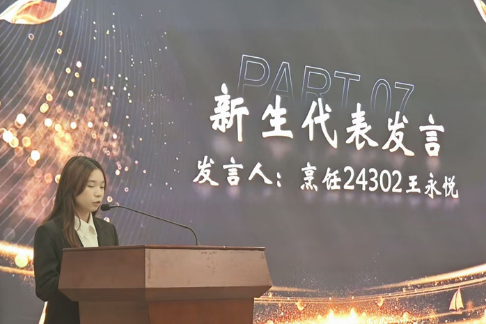 新生班辅导员马华强老师为军训先进集体和先进个人的颁发荣誉证书;烹饪21402班周嘉妮同学作为老生代表进行发言,烹饪23302班王永悦同学作为新生代表进行发言。