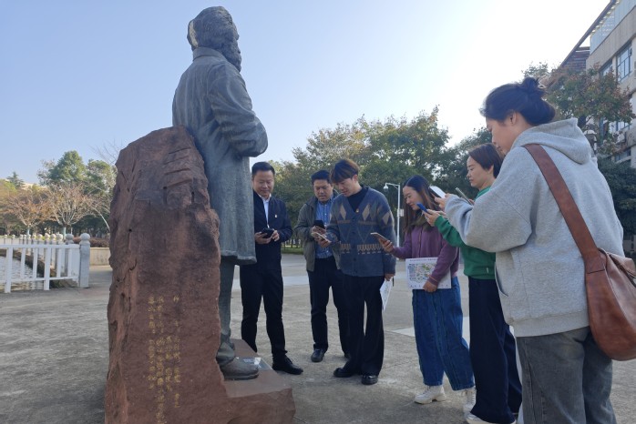 我系师生党员从中兴广场出发,沿着“清廉校园行”路线一路步行经过校史馆、求索桥、马克思雕像、孔圣园等九个蕴含廉政文化元素的校园文化景点,现场学习校园文化、廉政文化、党纪法规知识等内容,并扫码完成了线上测试。