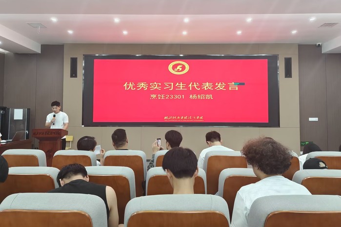 优秀实习生代表烹饪23301杨绍凯、烹饪23302周蔓彤分别分享了自己的实习经历和经验。在实习期间,他们在各自的岗位上勤奋努力,积极学习,完成了自己所负责的各项工作,为实习单位的发展做出了积极贡献。