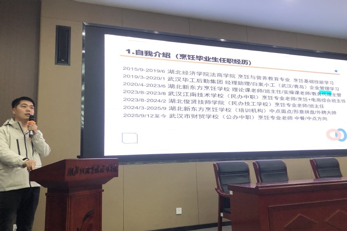 本网讯(通讯员 刘旨姝)12月7日晚,我系在J4-101举办校友分享会活动。武汉市财贸学校烹饪教师、原烹饪15401班王成欢校友受邀进行经验分享。系教研室主任殷昌利、辅导员马华强、教师李天以及大一、大二年级学生参会。