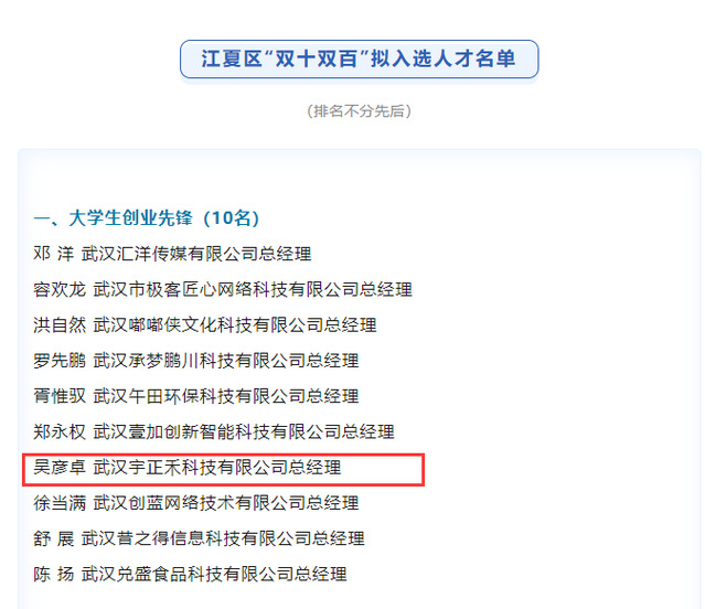 本网讯(通讯员 渠继昕 金超)近日,由中共武汉市江夏区委组织部、江夏区总工会、江夏区科经局联合举办的2022年“双十双百”人才选树活动获奖名单揭晓,我院工商管理系市经19401班吴彦卓同学成功入选江夏区“双十双百”人才名单,获评“大学生创业先锋”称号。