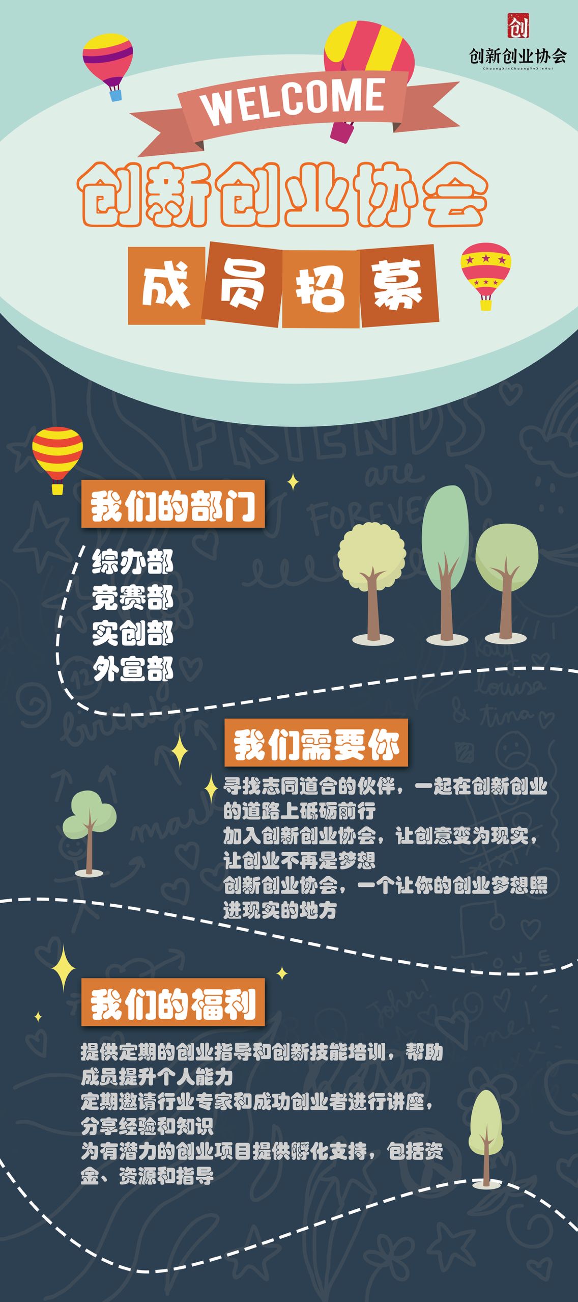 各部门岗位:综办部,外宣部,竞赛部,实创部会员以及协会非正式会员。