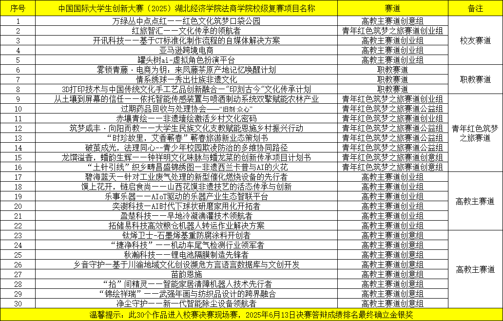 根据《关于做好中国国际大学生创新大赛(2025)万搏买球联赛官网(中国)官网校赛的通知》要求,团委、创新创业万搏买球联赛官网(中国)官网于近期组织专家对各系初赛推选送报的参赛作品进行了校赛复赛评审,根据复赛分数由高到低排序前30名(标黄)进入校赛决赛现场赛,2025年6月13日决赛最终成绩排名确立金奖10个,银奖20个,铜奖52个,优秀奖若干。现将复赛评审结果公布如下: