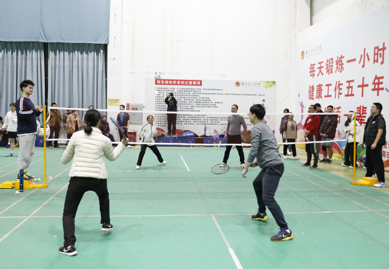 邓志华为羽毛球师生联谊赛开球,在场师生按照工作人员的指引前往观赛区域,共同观摩师生表演赛。