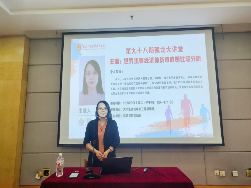 本网讯(通讯员 李文杰 摄影 李宛颉)10月29日下午16:00,大学生活动中心三号报告厅“第九十八期藏龙大讲堂”开讲,余玲副教授作“世界主要经济体货币政策比较分析”主题讲座,金融系副主任曾梦玲主持。