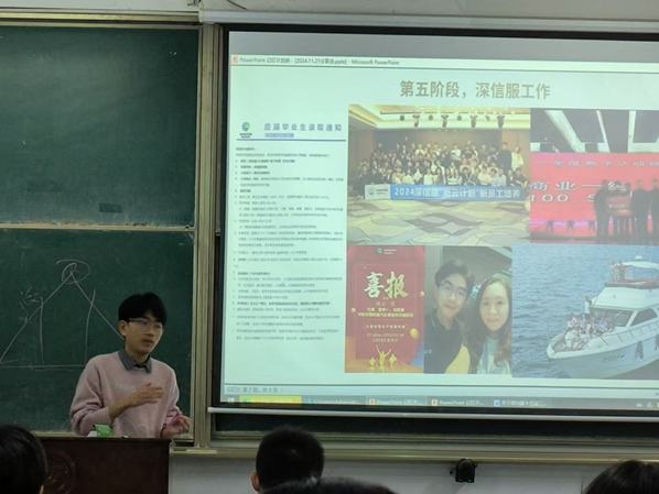 本次面对面讲座主题为“学长讲讲来时路”。付涛从自我介绍开始、到大学生活的积累沉淀、收获成绩、毕业优质就业几个阶段,分别讲述了促使成长的关键性事件和心得体会,他说:“大学中尝试各种各样的职位和责任,尝试做一个多边形战士,终会找到自己热爱。学习各种竞赛知识,与优秀的同学学习交流,不断充实自我。相信自己,坚韧不拔去克服重重困难,最终也会有意想不到的收获。”
