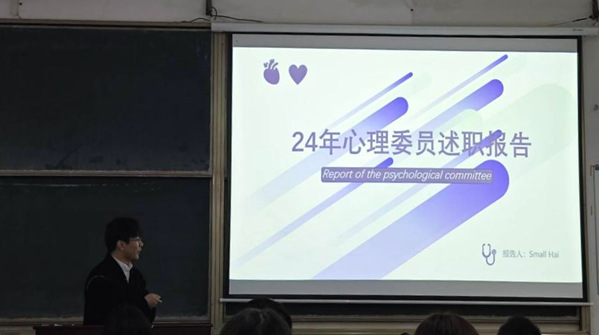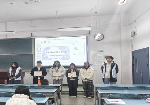 在宣布会议开始之后,各班级心理委员依次上台进行述职,他们分别从班级同学心理状况分析,工作中遇到的困难与挑战,未来工作的规划与展望等方面介绍了本班级心理工作的相关情况。评委们认真听取了各班级心理委员的述职,并进行了评分,根据评分结果,金融24401张芯语、金融24201海家禹、金融24403李雨池同学获得本学期优秀心理委员称号。