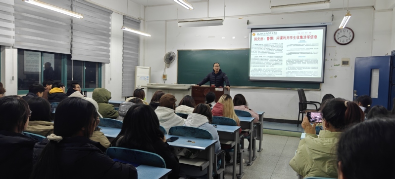 本次讲解以《中华人民共和国反间谍法》为主要内容,从案例分析出发,到内容讲解,系部统一素材,讲解了间谍行为、我国公民和组织在反间谍工作中的义务、安全防范工作规定等,对间谍利用学生收集涉军信息发出安全提醒。