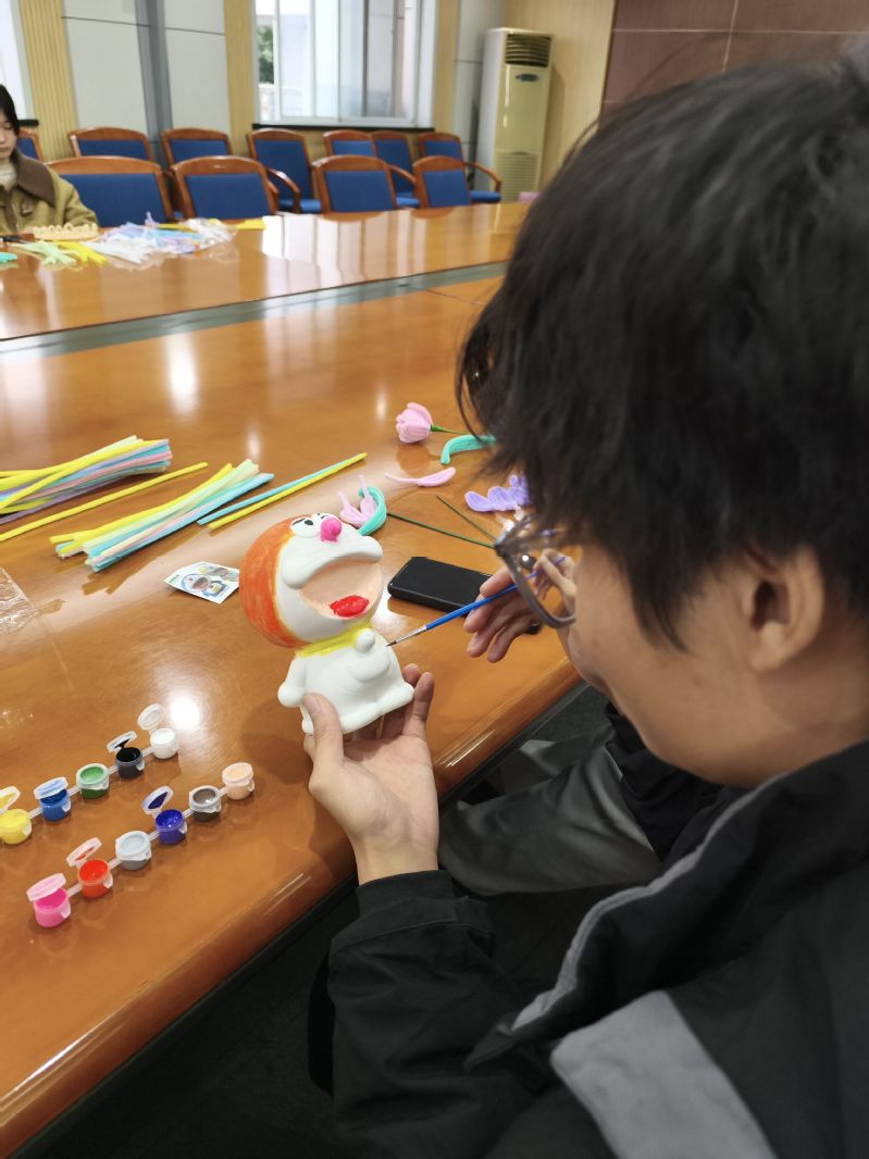 活动一开始,陈璐老师便问大家在面对焦虑和压力时,大家会做些什么,同学们有的回答自己会通过跑步的方式减轻压力,有的表示自己会听听音乐等方式来减轻压力。听完同学们的回答之后,老师向大家介绍了正念及正念冥想的相关概念,并通过一段视频带领同学们一起感受正念冥想。体验冥想后,同学们利用石膏娃娃或扭扭棒,带着刚刚正念冥想时对身体和心灵的感受,将自己手中的物品创造出了自己的心灵世界。来自金融22405班的黄智荣同学根据自己当下的情绪给石膏娃娃上了色,金融23401班的刘瑞霞同学利用手中的扭扭棒做出了一个五彩缤纷的花篮,同学们发挥自己的想象力制作出了代表当前的心灵世界。