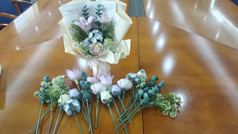 历经两小时的精心制作,三十余束风格各异的手工花束渐次绽放。有多位教师创新性地组合出渐变色调的花束,层次纹理在灯光下流转着温润光泽。这些永不凋零的艺术品不仅展现了金融专业教师的审美创造力,其缤纷色彩更象征着团队多元融合的特质。