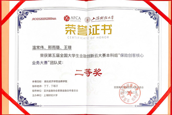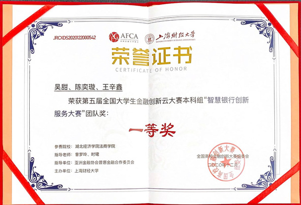 本网讯(通讯员 徐丽亨 曾梦玲)“第五届全国大学生金融创新云大赛”于2021年3月公布成绩,来自全国97所高校、共322支参赛团队、966名选手参加了本次大赛。金融学生参加了银行、保险2个赛项,经过激烈紧张的角逐,共有4个团队获奖,其中智慧银行创新服务赛项本科组获一等奖奖项一个,高职组获三等奖奖项一个,保险创客核心业务赛项本科组获二等奖奖项一个,高职组获三等奖奖项一个。曾梦玲、丁丁、时珺、丁石汀获优秀指导老师。
