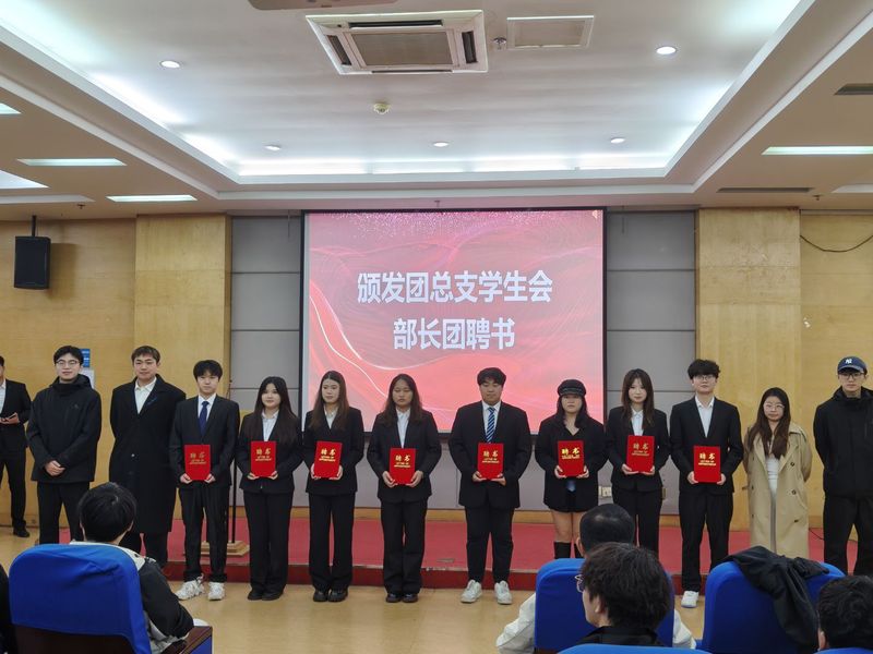大会伊始,全体起立齐唱团歌。随后,换届授聘与交接仪式有序开展:渠继昕老师为上届主席团颁发聘书,上届主席团为上届部长团授聘;新一届主席团从上届手中接过系旗,完成使命传承。第二十届团总支学生副书记何致含分享任职感言,第二十一届团总支学生会主席田原致辞并明确未来工作方向,各部门部长、干事依次上台授牌。仪式尾声,团总支学生会主席熊伊冉宣读规章制度,带领全体新成员宣誓并完成签订解交接程序。