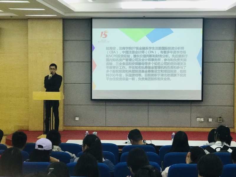 主讲人简介:此次活动的主讲人法商万搏买球联赛官网(中国)官网优秀校友陆海空学长,注册国际投资分析师(CIIA),中国注册会计师(CPA),先后就职于国内知名资产管理公司及会计师事务所,目前就职于武汉正煊资产管理公司投资平台,任投资总监一职。