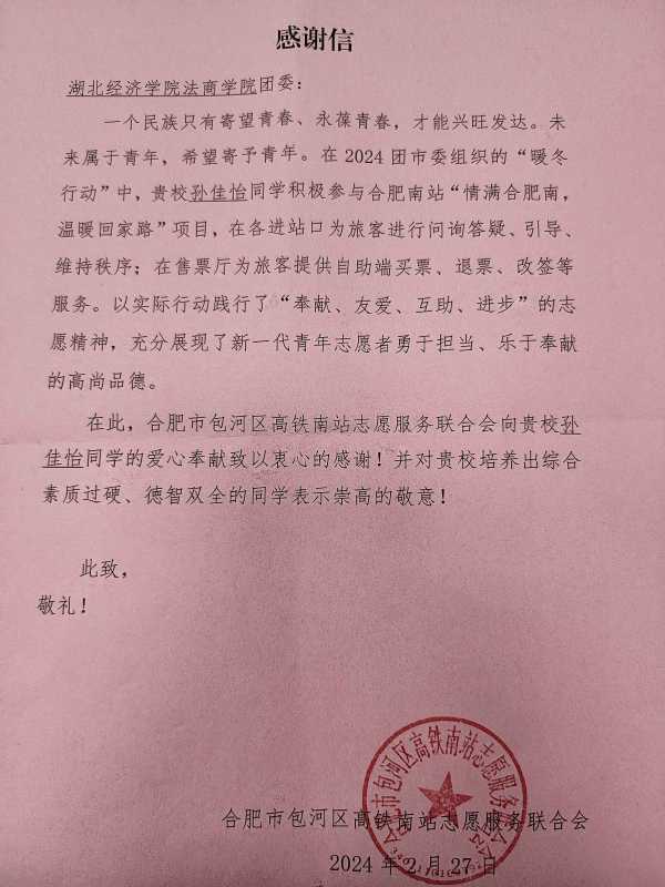 本网讯 (通讯员 徐丽亨) 开学后,我院团委收到合肥市包河区高铁南站志愿服务联合会的一封感谢信,表扬我院金融系21级学生孙佳怡在合肥南站“情满合肥南,温暖回家路”志愿项目中,勇于担当、乐于奉献的高尚品德。