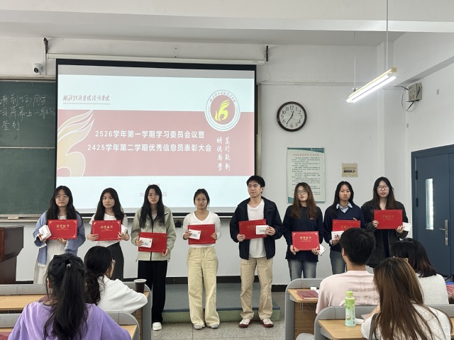 会议伊始,赵梓旭作为学生代表进行发言,他表示:学习委员是“老师的助手”与“同学的服务者”,需以责任之心筑牢学风根基,以创新之力激发学习活力。院学生会李慧灵同学宣读了2024-2025第二学期“优秀信息员”表彰文件,并为获奖同学颁发了奖品和荣誉证书。