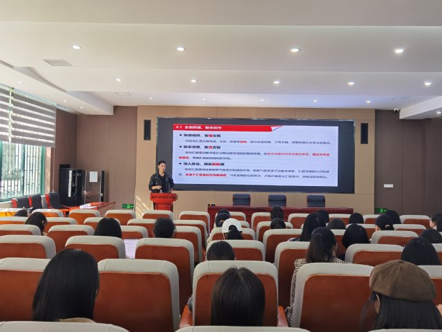 会议伊始,周瑞老师以教学创新、精彩呈现-现场汇报的实战技巧为主题,从评分索引、表达方式、服化设计、情境还原四个维度进行讲解现场汇报的相关注意事项。他谈到“现场汇报是对教学设计过程与教学成效的整体传播,在教学竞赛的特殊传播背景里,透过文字还原事实,明确汇报的目的和针对性。”周瑞结合自身参赛经历,分享了现场汇报的情境演练的重要性、教师职业的有声语言表达技巧以及现场汇报的文稿撰写与实际表达运用,给老师们提出了诸多的宝贵经验。
