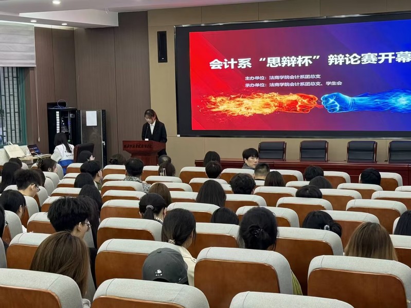 本网讯(通讯员 卢婧凤)4月8日晚,会计系于逸夫楼101室举行了“思辩杯”辩论赛开幕式。旅游与酒店管理系辅导员刘乐乐、会计系参赛选手参加了此次活动。